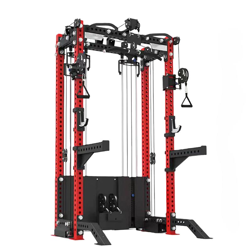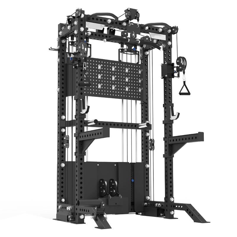 एकात्मिक संलग्नक: फ्रेम समायोजित करण्यायोग्य-उंची पुल-अप स्टेशन (मल्टी-ग्रिप), लेग ट्रेनिंग हुक, समाकलित करते.